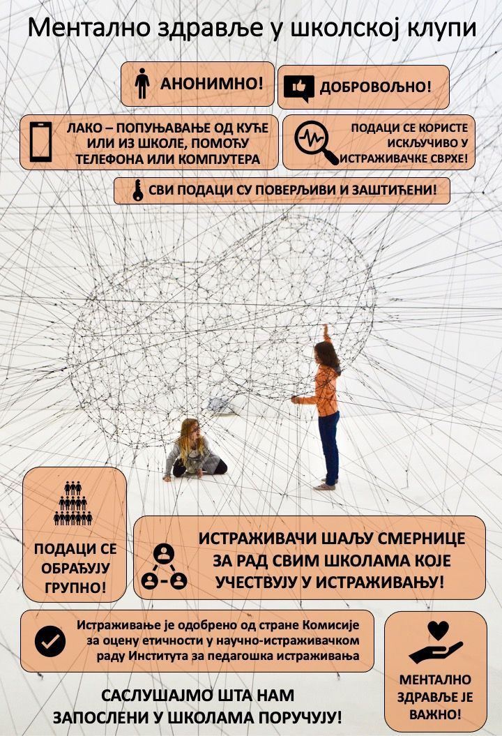 Године за нама биле су посебно изазовне за ментално здравље свих нас. Пандемија нас је подсетила колико је важно да водимо рачуна о менталном здрављу, будемо повезани и бринемо једни о другима. Проблеми у различитим секторима постали су видљивији – посебно проблеми у здравству и образовању. Пандемија нам је скренула пажњу на важну улогу коју запослени у школама имају током кризних периода и изазове са којима се сусрећу. Током претходне године, неколико медијски испраћених случајева насиља у школама поново је интензивирало причу о одговорности, али и о потребама запослених у образовању. Претходних година често говоримо о томе шта се очекује од запослених у школама. Време је да питамо запослене у образовању како они разумеју одређене аспекте свог посла и контекста у којем раде, да их питамо које су њихове потребе, ко све и на које начине може да помогне да заједничким снагама унапређујемо квалитет образовања и васпитања у Србији. Од марта 2023. године, истраживачи Института за педагошка истраживања у Београду покрећу два истраживања у којима ће бити позвани да учествују сви запослени у школама у Србији.
